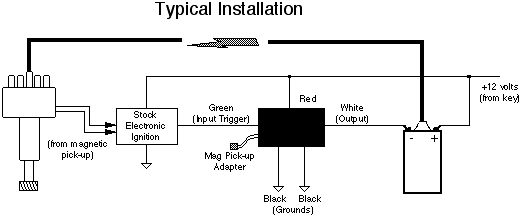 3.) ELECTRICAL CONNECTIONS: Keep in mind that the unit simply connects in series between the points (or electronic ignition) and the coil negative, and you shouldn't have any trouble. See figure 1 below.