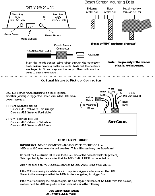f.) The SafeGuard RED wire supplies power to the system. It must be connected to 12 volts during cranking as well as with the key in the run position. On GM with HEI, this would be the pink wire at the three wire connector on the distributor cap or the "BATT" terminal on the cap itself. On Ford Dura Spark this would be the red wire at the Ford module. Use the wire splice provided.
