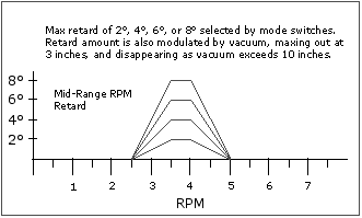 S3 and S4 select either 2°, 4°, 6°, or 8° of mid-range RPM retard. The unit starts retarding linearly at 2500 RPM, and reaches the maximum selected amount by 3500 RPM. At 4000 RPM, the unit starts readvancing, and is back to stock timing by 5000 RPM. The retard is also modulated by vacuum, reaching the selected maximum if the vacuum is less than three inches, and decreasing to zero when the vacuum exceeds ten inches. See the illustration below: