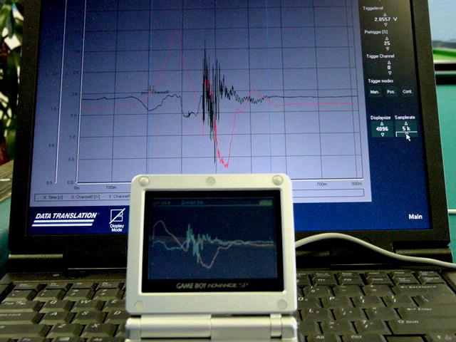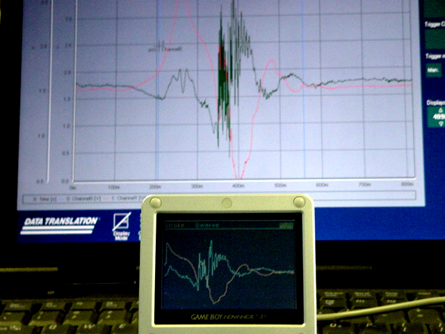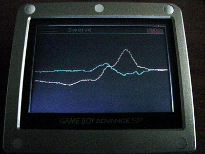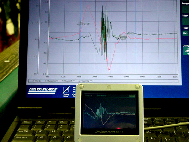 Here is a screen shot of the GameBoy, showing the traces when I wave the accelerometers in the air. The orange trace is the stroke, the blue trace is the swerve: